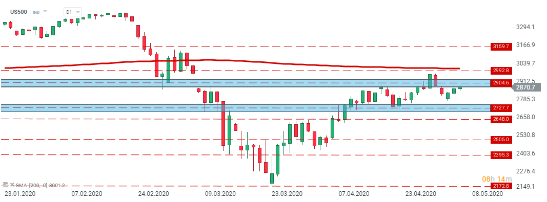 Le S & P500 (US500) a ouvert en hausse aujourd'hui et se dirige vers un niveau de résistance local à 2904,6 pts. Si une cassure se produit ci-dessus, la prochaine résistance à 2992,8 pts peut entrer en jeu. Le support peut être trouvé à 2727,7 pts. Source: xStation5