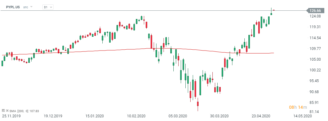 Le cours de l'action PayPal (PYPL.US) a enregistré une baisse importante en mars, puis la société a récupéré des pertes tout au long du mois d'avril. Actuellement, les actions de la société sont à des niveaux record. Si les résultats d'aujourd'hui pour le premier trimestre s'avéraient médiocres et que le niveau de 124,51 $ tombait, cela pourrait ouvrir la voie à une baisse plus importante du soutien à 116,11 $. Source: xStation5