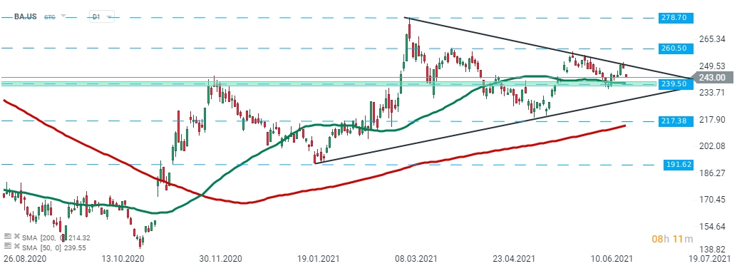 Boeing (BA.US) - vendredi, les acheteurs n'ont pas réussi à franchir la limite supérieure du triangle et le titre a commencé la séance d'aujourd'hui en baisse. Le support à court terme le plus proche se situe à 239,50 $ et coïncide avec la SMA 50 (ligne verte). Source : xStation5