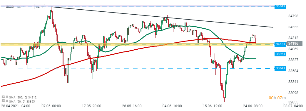 Vendredi, l'US30 a franchi une résistance majeure à 34181 pts qui coïncide avec la 200 SMA (ligne rouge). L'indice a commencé la séance d'aujourd'hui à la hausse, mais les acheteurs n'ont pas réussi à maintenir la dynamique et le prix a reculé. Si les acheteurs parviennent à reprendre le contrôle, l'indice peut encore se diriger vers la ligne de tendance baissière à long terme ou même vers le sommet historique à 35019 pts. Toutefois, si le sentiment actuel prévaut et qu'une cassure se produit sous le niveau susmentionné des 34181 pts, le prochain support se situe à 33961 pts. Source : xStation5