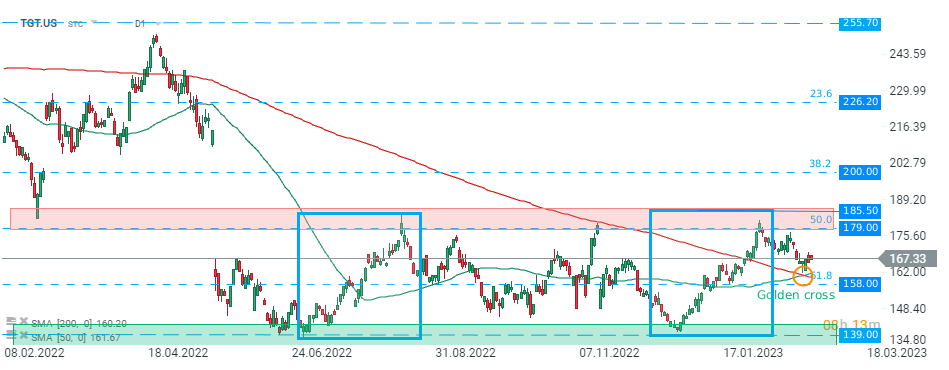 Target (TGT.US) a évolué latéralement ces derniers mois et récemment, le prix s'est retiré de la limite supérieure de la zone de consolidation. Néanmoins, les acheteurs ont réussi à stopper les baisses autour du support local à 158,00 $, ce qui coïncide avec le retracement de Fibonacci à 61,85 de la vague à la hausse commencée en mars 2020. De plus, la SMA à moyen terme de 50 jours (ligne verte) a dépassé le SMA à long terme de 200 jours ( ligne rouge). Cela a formé une formation de «croix dorée» haussière, qui peut parfois précéder un mouvement vers le haut. Néanmoins, tant que le prix se situe en dessous de la zone de résistance clé autour de 179,00-185,50 $, une autre impulsion à la baisse peut être lancée vers la limite inférieure de la consolidation à 139,00 $. Source : xStation5