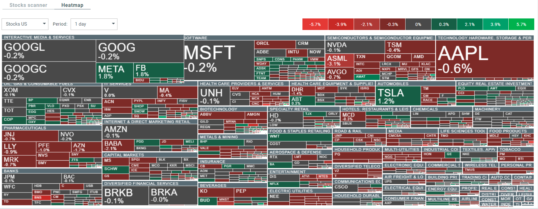 Actions de l'indice S&P 500 classées par secteurs et industries. La taille représente la capitalisation boursière. Source : xStation5
