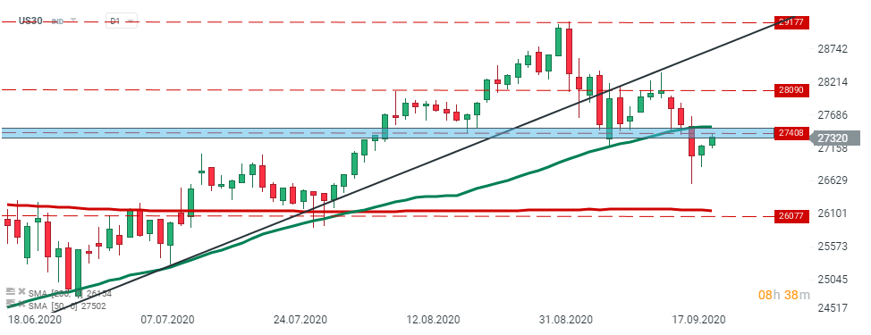 L'US30 teste le niveau de résistance de court terme à 27408 pts qui est en outre renforcé par la MM50 (ligne verte). Si les acheteurs parviennent à dépasser ce niveau, une impulsion à la hausse vers 28090 pts pourrait être lancée. Cependant, si les vendeurs parviennent à stopper leur progression, le prochain support à 26077 pts pourrait être ciblé. Source : xStation5