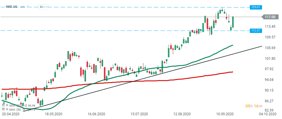 Le titre Nike (NKE.US) a fait un bond après que la société ait affiché des bénéfices trimestriels positifs. Si l'optimisme devait prévaloir, la résistance à 120,61 dollars pourrait entrer en jeu. Source : xStation5