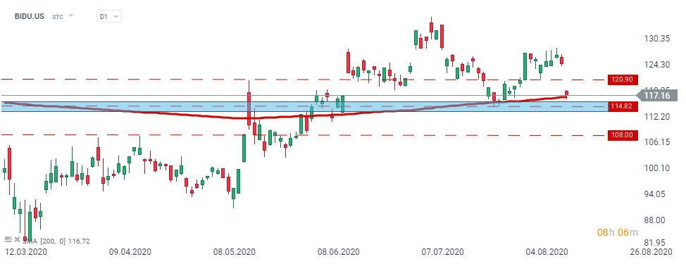 Baidu (BIDU.US) - Le titre a lancé la session d'aujourd'hui avec un gap de prix baissier et se dirige vers une résistance à 114,82 $ par action qui est en outre renforcée par la MM 200 (ligne rouge). Si une cassure se produit en dessous, le prochain support se situera autour de 108,00 $ par action. La résistance locale se situe à 120,00 $ par action. Source : xStation5