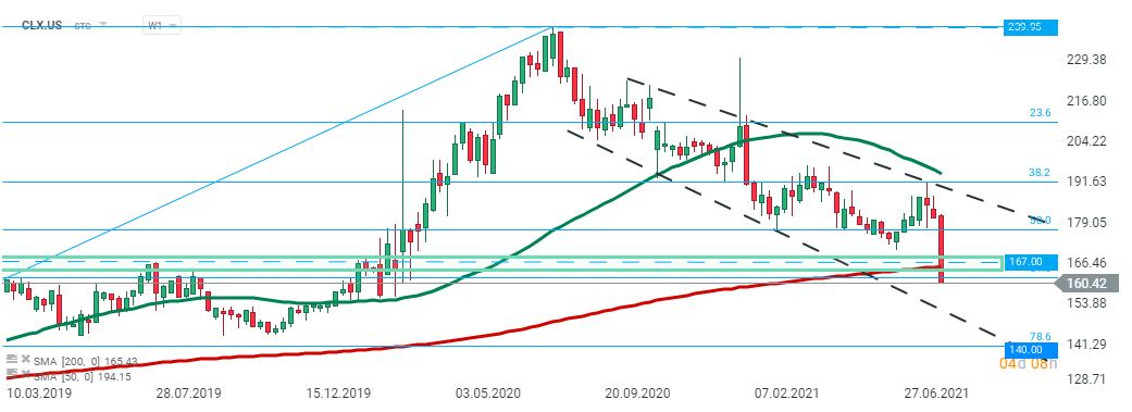 L'action Clorox (CLX.US) a débuté la séance d'aujourd'hui en forte baisse suite à des chiffres trimestriels décevants. Le cours a cassé le support majeur à 167,00 $ qui fait maintenant office de résistance. Ce niveau est renforcé par la SMA 200 (ligne rouge) et le retracement de Fibonacci à 61,8% de la dernière vague de hausse. Si le sentiment actuel prévaut, la baisse pourrait s'étendre jusqu'au support de 140,00 $, qui coïncide avec le retracement de Fibonacci à 78,6%. Source : xStation5