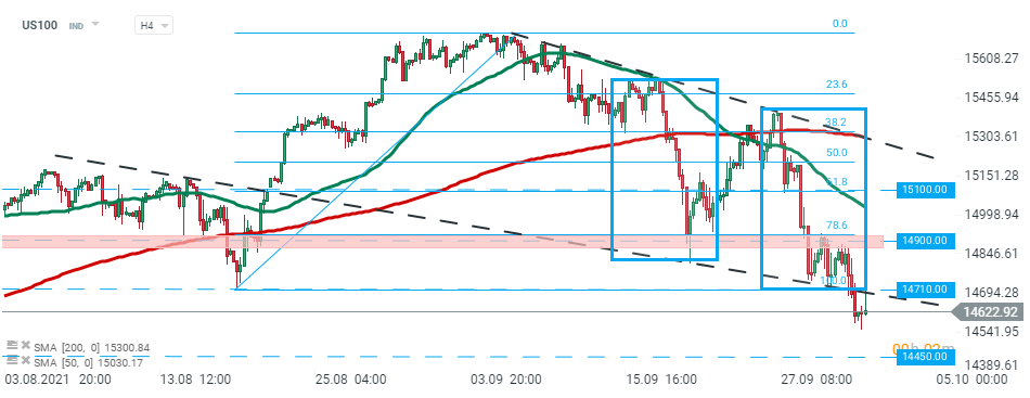 Les indices américains ont commencé la séance d'aujourd'hui en hausse, mais l'humeur s'est dégradée après la publication des données économiques à 16h00, qui ont montré que l'indice PMI manufacturier de l'ISM a dépassé les attentes des analystes et que le sentiment des consommateurs a été révisé à la hausse à 72,8 en septembre. Plus tôt dans la séance, les dépenses personnelles ont dépassé les attentes du marché, tandis que l'indice PMI manufacturier américain IHS Markit a été révisé à la hausse à 60,7 en septembre, contre 60,5 précédemment, mais en dessous de 61,1 en août. Entre-temps, les prix PCE ont continué à indiquer une forte pression inflationniste. Sur le plan politique, les démocrates de la Chambre des représentants ont reporté le vote d'un projet de loi sur l'infrastructure de 1 000 milliards de dollars, car aucun accord n'a encore été conclu. Par ailleurs, le Sénat et la Chambre ont adopté un projet de loi de crédits à court terme qui permettra au gouvernement de fonctionner jusqu'au 3 décembre.
