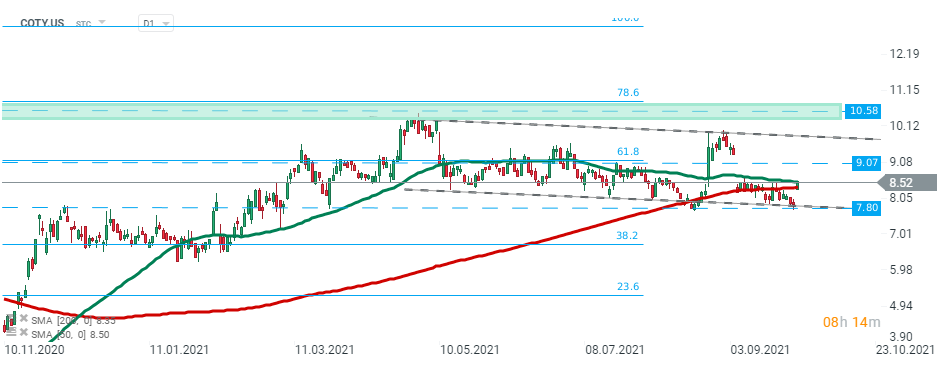 L'action Coty (COTY.US) a commencé la session d'aujourd'hui en hausse et le cours teste actuellement la SMA 50 (ligne verte) et la SMA 200 (ligne rouge). En cas de cassure à la hausse, un mouvement haussier pourrait s'étendre jusqu'à la résistance de court terme à 9,07 $ ou même la résistance à 10,58 $ qui est marquée par le retracement de Fibonacci à 78,6 % de la dernière vague de baisse. D'autre part, si les vendeurs parviennent à stopper la progression, le support le plus proche se situe à 7,80 $ et coïncide avec la limite inférieure du canal susmentionné. Source : xStation5
