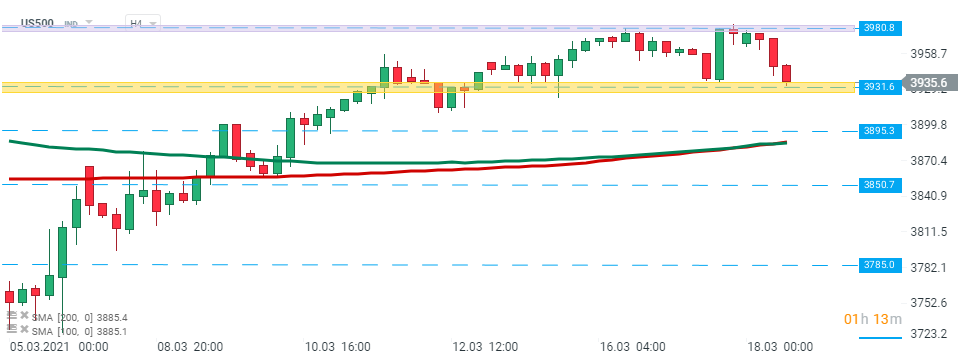 Les indices américains ont débuté la séance d'aujourd'hui dans une ambiance mitigée, le Nasdaq a chuté de près de 1,5 % et le S&P 500 a perdu près de 0,6 %, tandis que le Dow Jones a progressé de 0,12 %, les rendements du Trésor continuant de s'envoler. Le rendement du Trésor à 10 ans a bondi de 11 points de base pour atteindre 1,75 %, son plus haut niveau en 14 mois, tandis que l'obligation à 30 ans s' autour du niveau de 2,50 %, ce qui met sous pression les valeurs de croissance, car leurs rendements futurs ont moins de valeur aujourd'hui. Hier, la Fed s'est engagée à ne pas relever les taux d'intérêt avant 2023 et a revu à la hausse les prévisions de croissance du PIB et d'inflation. La Fed continue de penser que tout pic d'inflation sera probablement temporaire, mais il semble que ces déclarations n'aient pas réussi à calmer les nerfs des investisseurs. Pendant ce temps, les opérateurs ont assimilé une série de données économiques mitigées en provenance de l'économie américaine. Les demandes hebdomadaires d'allocations chômage ont bondi à 770 000 alors que les analystes s'attendaient à une baisse à 700 000. L'indice de la Fed de Philadelphie a bondi à 51,8, soit le plus haut niveau depuis 1973, dépassant largement les estimations du marché (22,0).