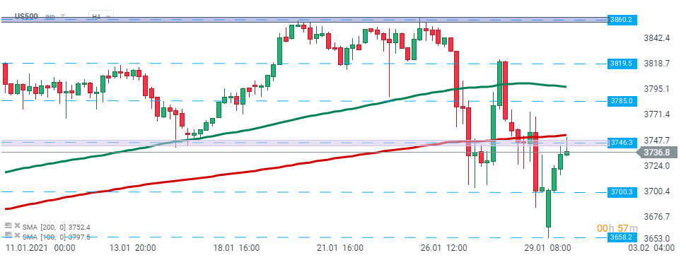 L'US500 tente d'effacer les baisses de la semaine dernière. L'indice teste actuellement la résistance à 3746 pts qui est en outre renforcée par la SMA 200 ( ligne rouge). Si les acheteurs parviennent à dépasser ce niveau, une impulsion à la hausse vers les 3785 pts pourrait être amorcée. D'autre part, une fois que les vendeurs auront repris le contrôle, le support à 3700 pts pourrait être menacé. Source : xStation5