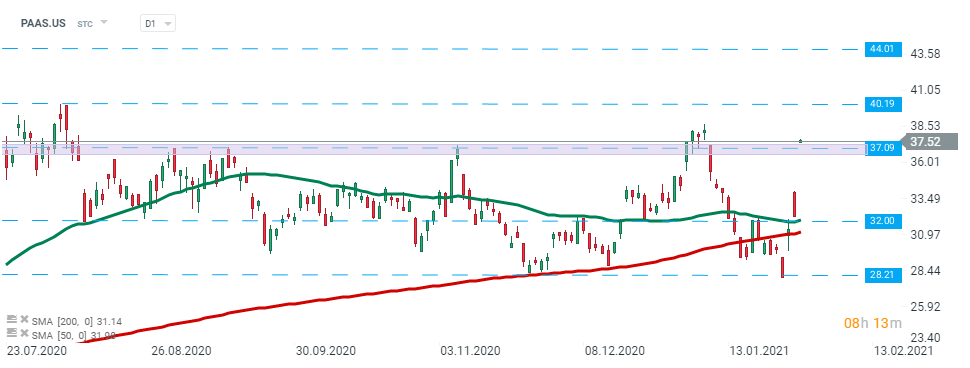 Le titre Pan Am Silver (PAAS.US) a commencé la séance d'aujourd'hui avec un gap de cours haussier et teste actuellement la résistance majeure à 37,09 $. Si le sentiment actuel prévaut, le mouvement à la hausse pourrait s'étendre jusqu'à la zone des 40,19 $ ou même jusqu'au niveau des 44,00 $ où se trouvent les records historiques. D'autre part, si les vendeurs parviennent à reprendre le contrôle, une autre impulsion à la baisse vers le support à 32,00 $ pourrait être initiée. Source : xStation5