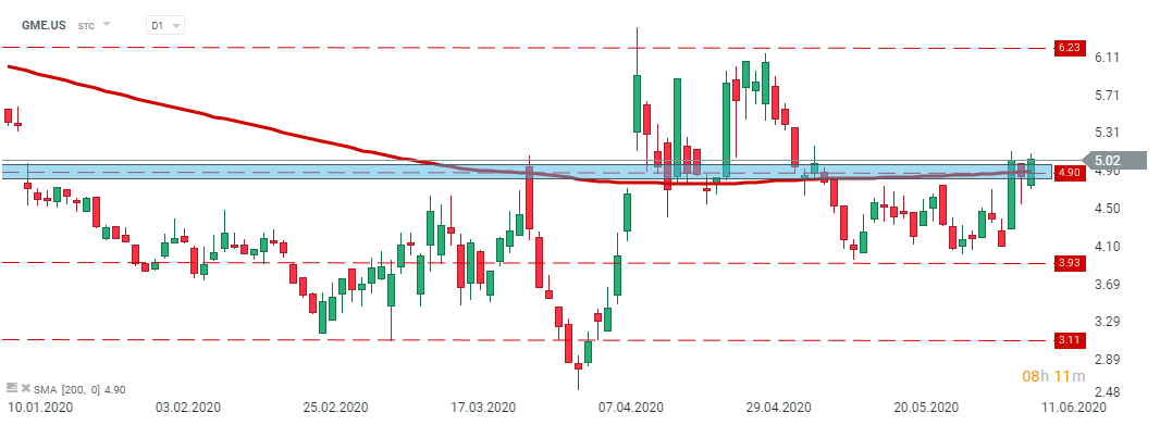 Le cours de GameStop (GME.US) teste le niveau de résistance clé à 4,90 $, qui est en outre renforcé par la moyenne mobile à 200 périodes (ligne rouge). Si le sentiment actuel prévaut, le mouvement à la hausse vers 6,23 $ pourrait être envisagé. Cependant, une rupture en dessous de la moyenne mobile 200 invalidera le scénario haussier. Source: xStation5