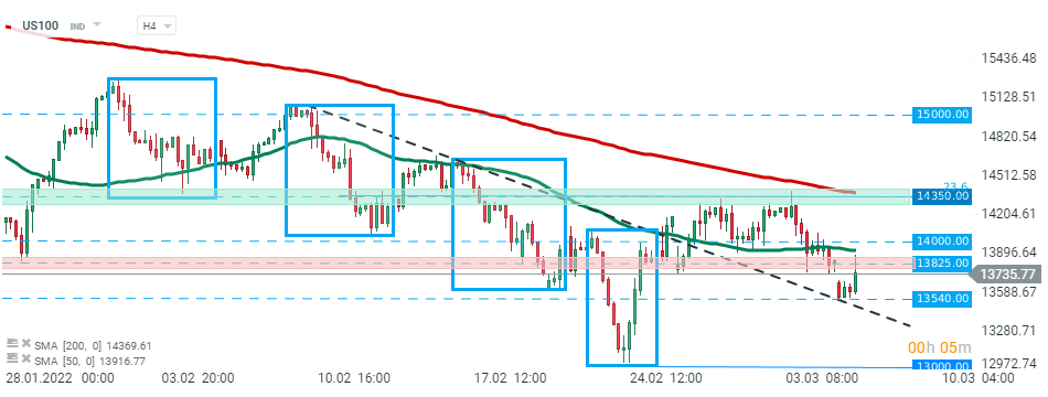 L'US100 a commencé la séance d'aujourd'hui en hausse, mais les acheteurs peinent à franchir la résistance à 13825 pts. Le support le plus proche est situé autour de 13540 pts. Source : xStation5