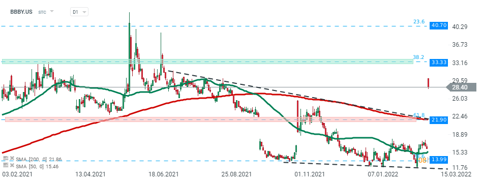 L'action Bed Bath & Beyond (BBBY.US) a commencé la séance d'aujourd'hui avec un gap haussier massif et s'échange au-dessus du support majeur de 21,90 $ qui coïncide avec le retracement de Fibonacci à 61,8 % de la vague haussière d'avril 2020 et la SMA 200 (ligne rouge). Si le sentiment actuel prévaut, le mouvement haussier pourrait s'accélérer vers la résistance à 33,33 $. Source : xStation5