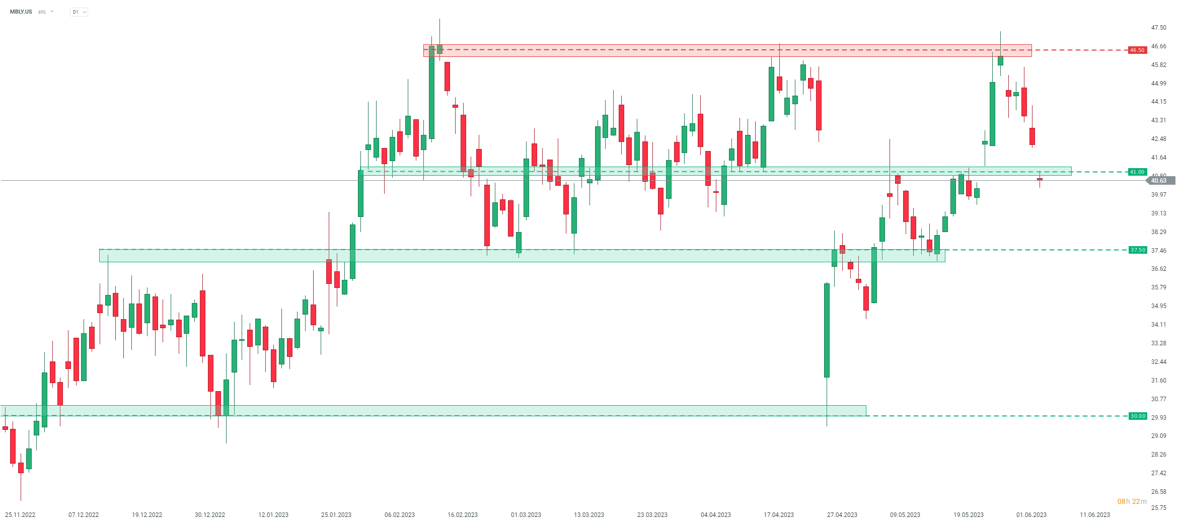 Mobileye Global (MBLY.US) se négocie à la baisse aujourd'hui après qu'Intel a annoncé son intention de vendre une partie de sa participation dans la société. L'action a lancé la négociation d'aujourd'hui avec un gap de prix baissier d'environ 5 % et est tombée en dessous de la zone de support de 41 $. Cependant, une tentative de récupération de ces pertes pourrait être repérée dans les premières minutes de négociation au comptant à Wall Street aujourd'hui. Source : xStation5