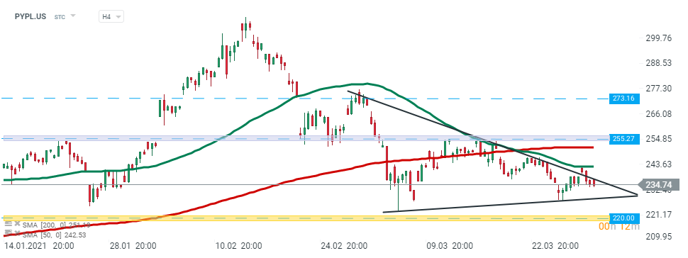 L'action PayPal Holdings (PYPL.US) a débuté la séance d'aujourd'hui en légère hausse et s'approche de la limite supérieure du triangle qui coïncide avec la SMA 50 (ligne verte). En cas de franchissement à la hausse, le mouvement ascendant pourrait s'accélérer en direction de la résistance à 255,27 $. En revanche, si les vendeurs parviennent à reprendre le contrôle et à casser la limite inférieure de la formation, le support à 220,00 $ pourrait être menacé. Source : xStation5