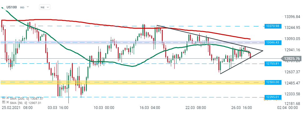 L'US100 a cassé la SMA 50 (ligne verte) et teste la limite inférieure du triangle. Si les vendeurs parviennent à la franchir, la baisse pourrait s'étendre jusqu'à la zone des 12755 pts. D'autre part, le franchissement de l'importante zone de résistance autour de 13046 pts, qui se compose de la limite supérieure de la formation triangulaire susmentionnée et de la SMA 200 (ligne rouge), pourrait ouvrir la voie à une plus grande impulsion à la hausse. Source : xStation5
