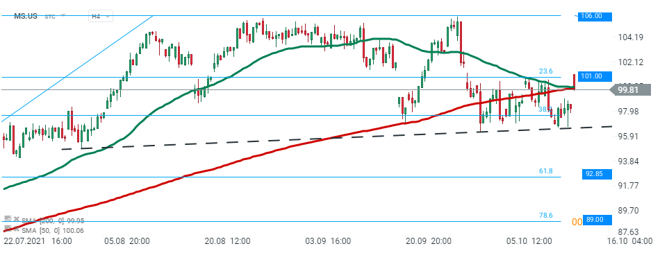 L'action Morgan Stanley (MS.US) a rebondi hier sur la ligne de tendance ascendante et teste actuellement la résistance de court terme à 101,00 $, qui coïncide avec le retracement de Fibonacci à 23,6% de la vague ascendante amorcée en juin et la SMA 200 (ligne rouge). En cas de cassure à la hausse, le mouvement ascendant pourrait s'accélérer vers les récents sommets de 106,00 $. Source : xStation5