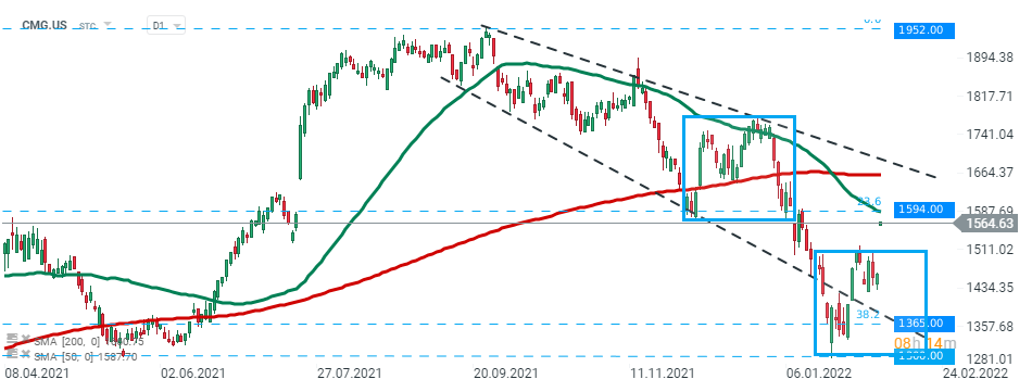 L'action Chipotle Mexican Grill (CMG.US) a subi une correction de 33% au cours des derniers mois, mais il semble que les acheteurs aient réussi à stopper les baisses autour du niveau de 1300,00 $. L'action a commencé la séance d'aujourd'hui avec un gap de cours haussier et se dirige vers une résistance majeure à 1594,00 $, marquée par le retracement de Fibonacci à 23,6 % de la vague haussière déclenchée en mars 2020 et la SMA 50 (ligne rouge). Source : xStation5