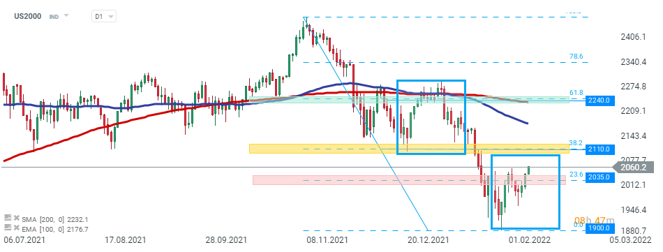 L'US2000 a rebondi après un récent et fort sell-off. Les acheteurs ont réussi à amener le cours au-dessus de la résistance de court terme à 2035 pts, marquée par le retracement de Fibonacci à 23,6 % de la dernière vague de baisse. Si le sentiment actuel prévaut, le mouvement haussier pourrait s'accélérer en direction de la prochaine résistance à 2110 pts qui coïncide avec le retracement à 38,2 % et la limite supérieure de la structure 1:1. Source : xStation5