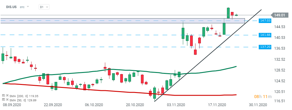 La réaction du marché à l'annonce des licenciements de Disney (DIS.US) a été limitée. Tant que le cours se situe au-dessus du support à 147,03 dollars, une nouvelle hausse est possible. Toutefois, si les vendeurs parviennent à passer en dessous de ce niveau, le prochain support à 141,66 dollars pourrait être menacé. Source : xStation5