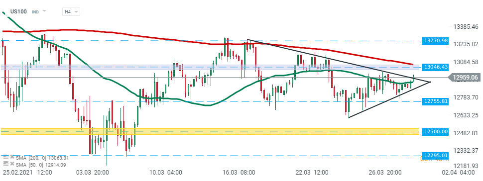 Les indices américains ont commencé la séance d'aujourd'hui en hausse, les investisseurs ayant assimilé la déclaration de la Maison Blanche concernant le plan d'infrastructure de Biden. Vous trouverez plus de détails sur ce sujet dans notre article d'aujourd'hui " La Maison Blanche communique les détails du plan d'infrastructure de Biden ". Le président Biden devrait prononcer un discours sur ce sujet à 21h20 aujourd'hui. Pendant ce temps, le rendement du Trésor américain à 10 ans s'est légèrement replié, passant d'un sommet de 14 mois de 1,77% à 1,73%, ce qui a enlevé une certaine pression sur les valeurs technologiques et permis au Nasdaq Composite de grimper de 0,6%. Sur le front des données, les entreprises privées aux États-Unis ont créé 517 000 emplois en mars, alors que les analystes s'attendaient à 550 000. Il s'agit de la plus forte augmentation de la masse salariale privée en 6 mois.