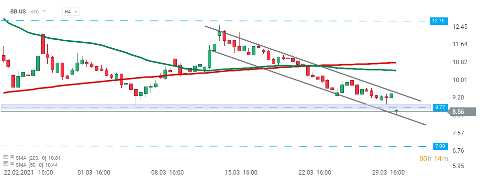L'action BlackBerry (BB.US) s'est échangé récemment dans un canal descendant. Aujourd'hui, le cours teste le support majeur à 8,77 $ qui est marqué par les réactions précédentes des cours. En cas de cassure à la baisse, la baisse pourrait s'accélérer vers le prochain support à 7,00 $. D'autre part, si les acheteurs parviennent à stopper la baisse, alors une impulsion à la hausse vers la limite supérieure du canal pourrait être initiée. Source : xStation5