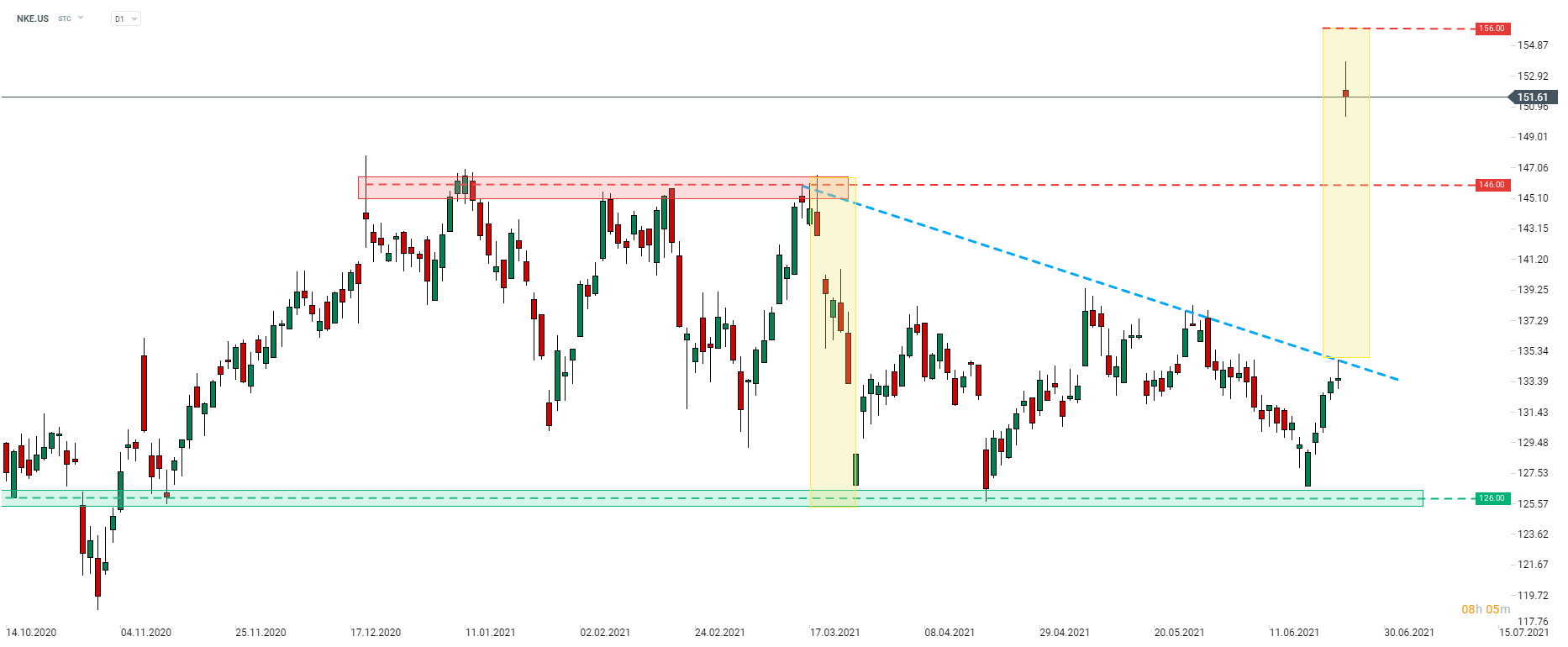 Nike (NKE.US) a lancé la négociation d'aujourd'hui avec un grand gap de prix haussier après la publication de solides bénéfices pour le quatrième trimestre fiscal et des prévisions optimistes pour l'exercice 2022. L'action a bondi au-dessus de la zone des 146,00 $ qui marquait les précédents records. Il convient de noter que l'action a dépassé la limite supérieure d'une configuration en triangle descendant. La zone de rupture potentielle de cette configuration indique que la première résistance à court terme pour Nike peut être trouvée dans la zone des 156,00 $. Source : xStation5