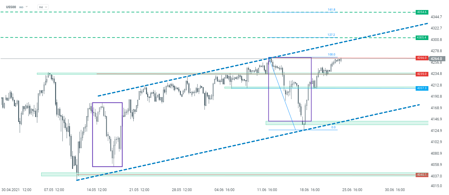L'indice S&P 500 a atteint un nouveau sommet historique au début de la séance au comptant d'aujourd'hui. Toutefois, les contrats à terme sur l'indice S&P 500 (US500) ont légèrement augmenté au cours des échanges européens du matin du 15 juin. Néanmoins, l'US500 n'est pas loin de son plus haut historique et il y a de fortes chances que nous assistions à un nouveau record intraday sur les marchés à terme également. L'indice s'échange au sein d'un canal ascendant et en cas de cassure vers de nouveaux records, la limite supérieure du canal sera la première résistance à surveiller (zone des 4 300 pts). A noter qu'elle coïncide plus ou moins avec le retracement extérieur de 127,2% de la dernière correction à 4 305 pts.