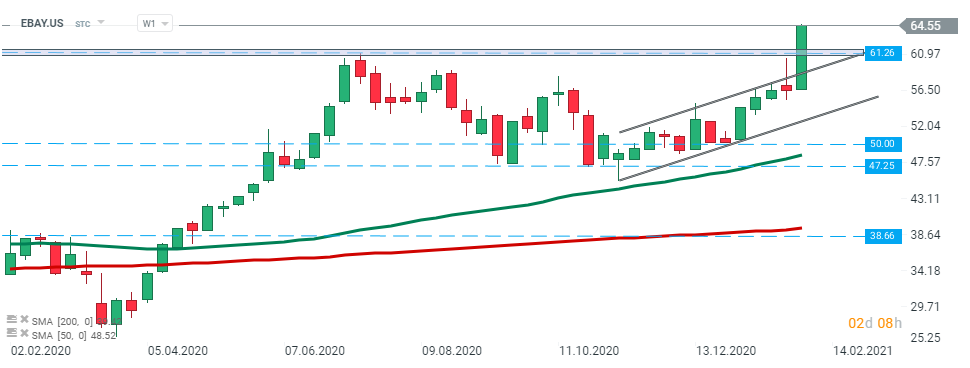 Le titre EBay (EBAY.US) a commencé la séance d'aujourd'hui à la hausse, son cours a franchi la limite supérieure du canal ascendant et a atteint un nouveau record. Source : xStation5