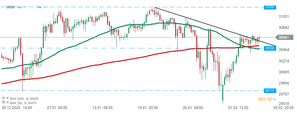 US30 : les acheteurs ont réussi à dépasser la ligne de tendance à la baisse. Si le sentiment actuel prévaut, l'indice pourrait se redresser vers son record historique de 31 200 pts. D'autre part, si les vendeurs reprennent le contrôle, la zone des 30 500 pts reste le support le plus proche à surveiller et est en outre renforcée par la SMA 50 (ligne verte) et la SMA 200 ( ligne rouge). Source : xStation5