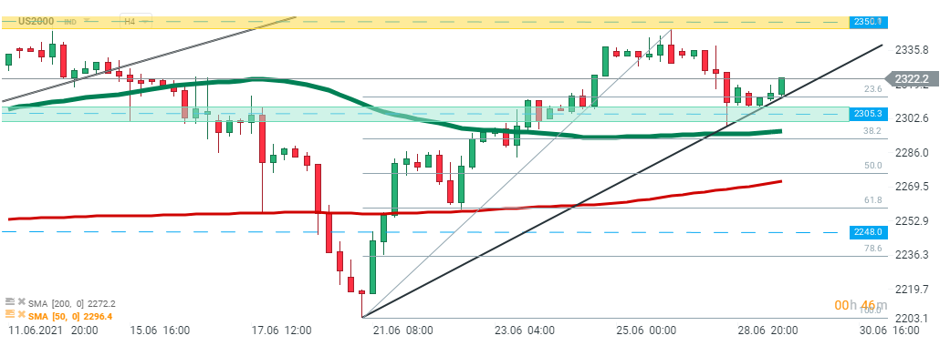 US2000 s'est négocié sous pression hier, mais les acheteurs ont réussi à stopper la baisse au support de 2305 pts qui est renforcé par le retracement de 23,6% de Fibonacci de la dernière vague de hausse et la ligne de tendance à la hausse. Si les acheteurs parviennent à maintenir la dynamique actuelle, le sommet historique à 2350 pts pourrait être touché. Source : xStation5