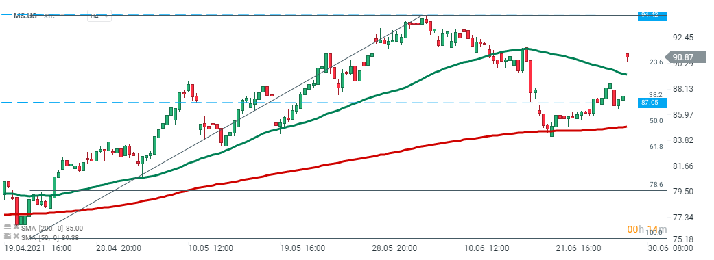 L'action Morgan Stanley (MS.US) a lancé la séance d'aujourd'hui avec un gap haussier et a dépassé la SMA 50 (ligne verte) qui coïncide avec le retracement de 23,6% de Fibonacci de la dernière vague haussière qui sert maintenant de support. Si le sentiment actuel prévaut, alors l'impulsion haussière pourrait s'accélérer vers le sommet historique de 94,42 $. Source : xStation5