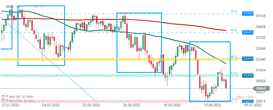 L'US30 a repris sa baisse après que les acheteurs n'aient pas réussi à rester au-dessus du support majeur à 31320 pts, ce qui coïncide avec le retracement Fibonacci à 23,6 % de la dernière vague baissière et agit désormais comme première ligne de résistance. Tant que le prix reste en dessous de ce niveau, le sentiment majeur reste baissier. Le support à 29615, qui est marqué par la limite inférieure de la structure 1:1, agit comme la cible la plus proche pour les vendeurs. Source : xStation5