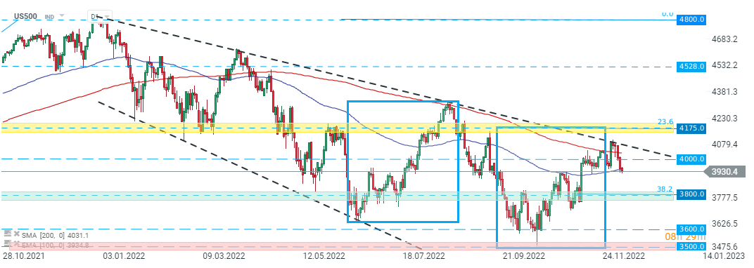 L'US500 a cassé sous le support clé à 4000 pts hier, mais le mouvement à la baisse a été stoppé par l'EMA 100 (ligne violette). Tant que le prix se situe au-dessus, une autre impulsion à la hausse peut être lancée. D'un autre côté, si les vendeurs parviennent à maintenir l'élan récent, un support majeur à 3800 pts pourrait être menacé. Source : xStation5