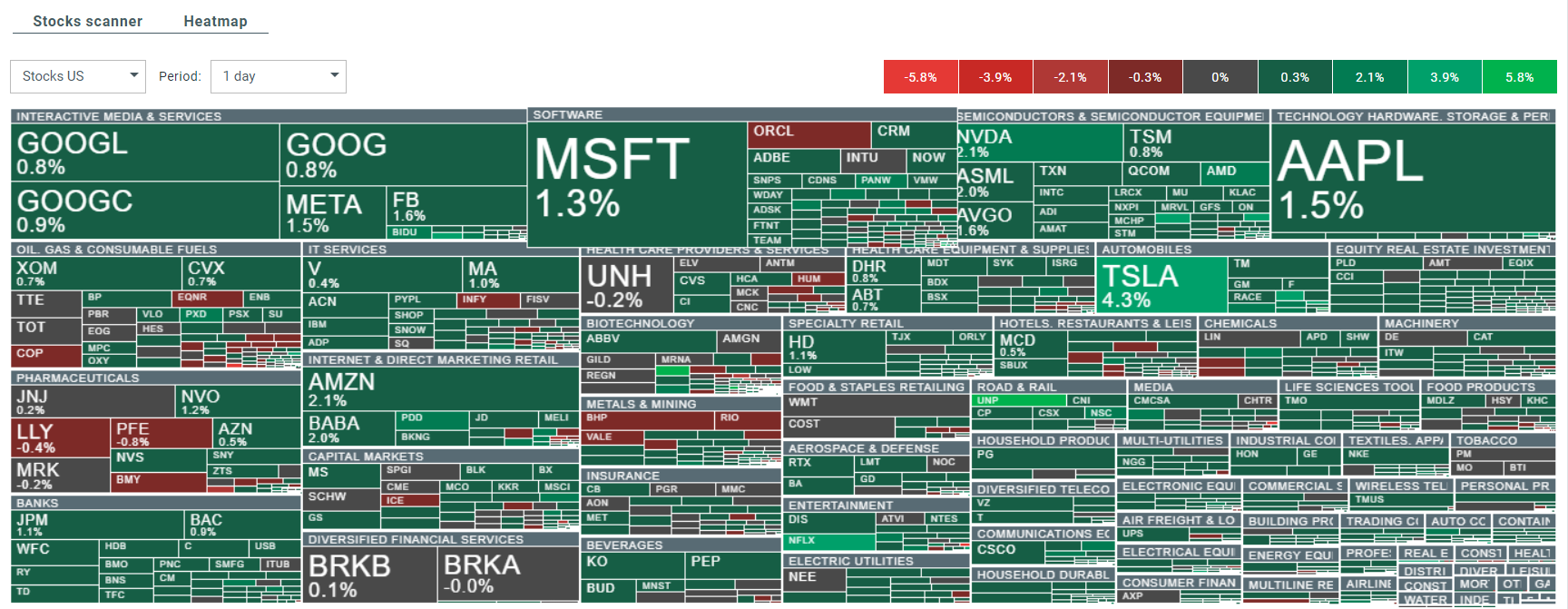 Actions de l'indice S&P 500 classées par secteurs et industries. La taille représente la capitalisation boursière. Source : xStation5