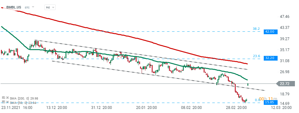 L'action Bumble (BMBL.US) évolue dans une tendance baissière depuis longtemps. Néanmoins, le prix a rebondi sur le plus bas historique à 15,85 $ suite à des résultats trimestriels optimistes. Si le sentiment actuel prévaut, le mouvement haussier pourrait s'accélérer en direction de la résistance à 32,20 $ qui coïncide avec le retracement de Fibonacci à 23,6 % de la vague de baisse lancée en février 2021. Source: xStation5