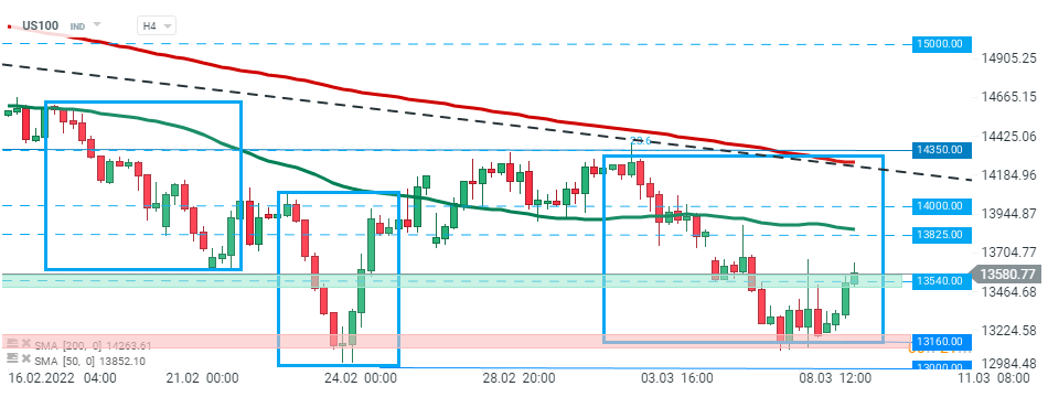 Les indices américains ont débuté la séance d'aujourd'hui en hausse, le Dow Jones a gagné 1,6 % tandis que le S&P 500 et le Nasdaq 100 ont progressé de 2 % et 2,5 %, respectivement, après que le conseiller du président Zelensky a indiqué que l'Ukraine était prête à une solution diplomatique, toutefois sous plusieurs conditions. L'attention des investisseurs va maintenant se porter sur l'annonce des sanctions russes et sur le rapport d'inflation américain de février, qui pourrait influencer le rythme du resserrement de la Réserve fédérale.