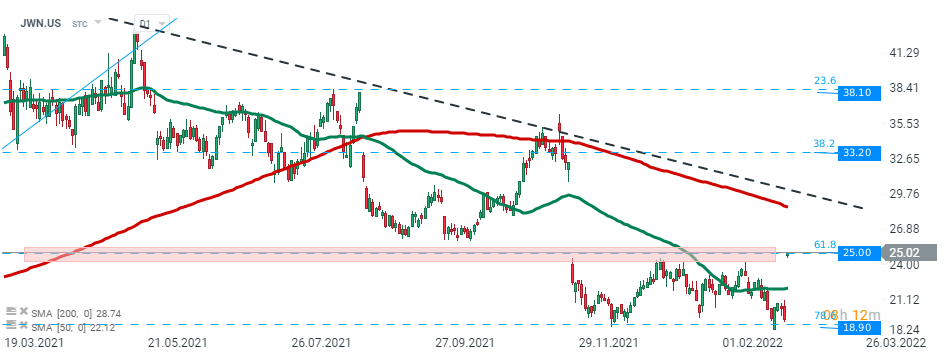 L'action Nordstrom (JWN.US) a lancé la séance d'aujourd'hui avec un gap haussier et teste actuellement la résistance à 25,00 $ qui coïncide avec le retracement de Fibonacci à 61,8 % du dernier mouvement haussier. Source: xStation5