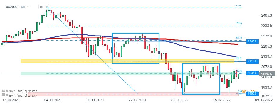 L'US2000 a été touché hier, mais les acheteurs ont réussi à reprendre le contrôle mercredi et l'indice s'approche de la résistance de court terme à 2035 pts qui coïncide avec le retracement de Fibonacci à 23,6 % de la dernière correction baissière. Si les acheteurs parviennent à maintenir le contrôle plus tard dans la séance, le mouvement haussier pourrait s'accélérer en direction de la résistance à 2110 pts, qui coïncide avec la borne supérieure de la structure 1:1 et le retracement à 38,2 %. En revanche, si les vendeurs exercent une pression baissière sur le marché, le support à 1900 pts pourrait être en danger. Source: xStation5