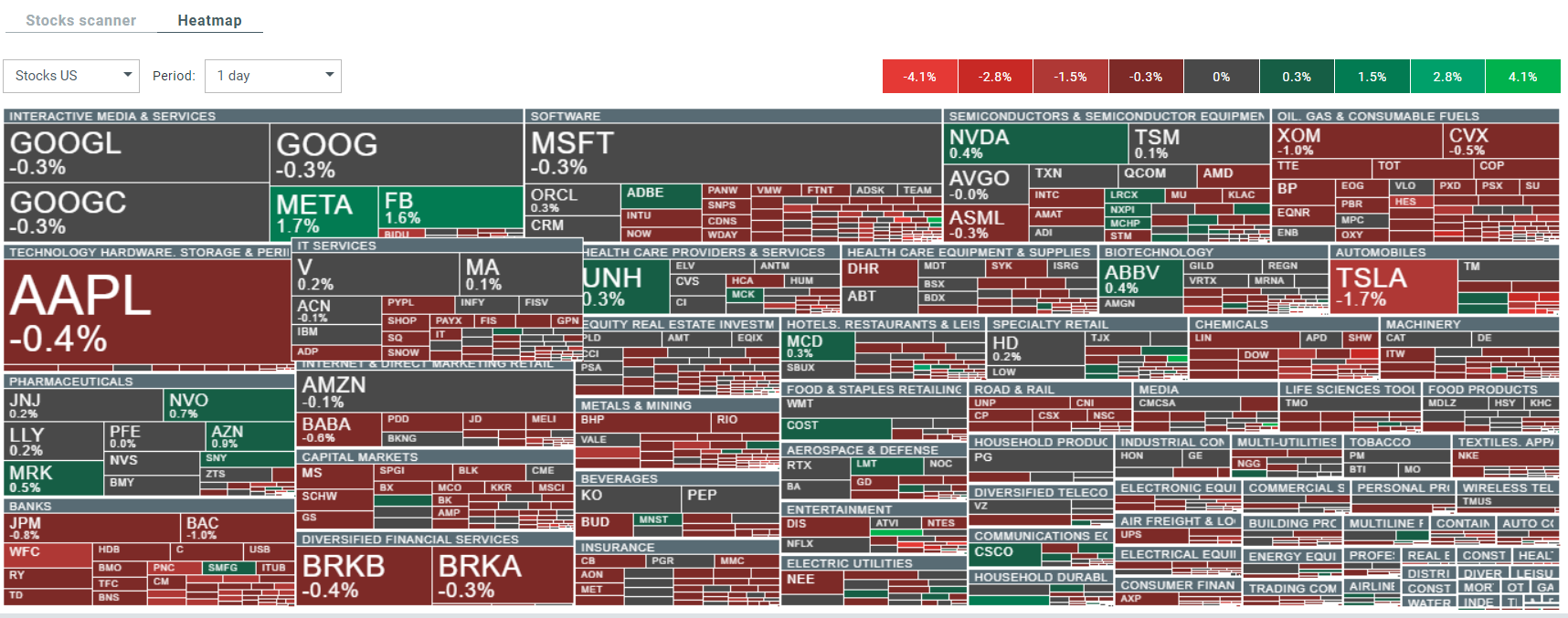 Actions de l'indice S&P 500 classées par secteurs et industries. La taille représente la capitalisation boursière. Source : xStation5