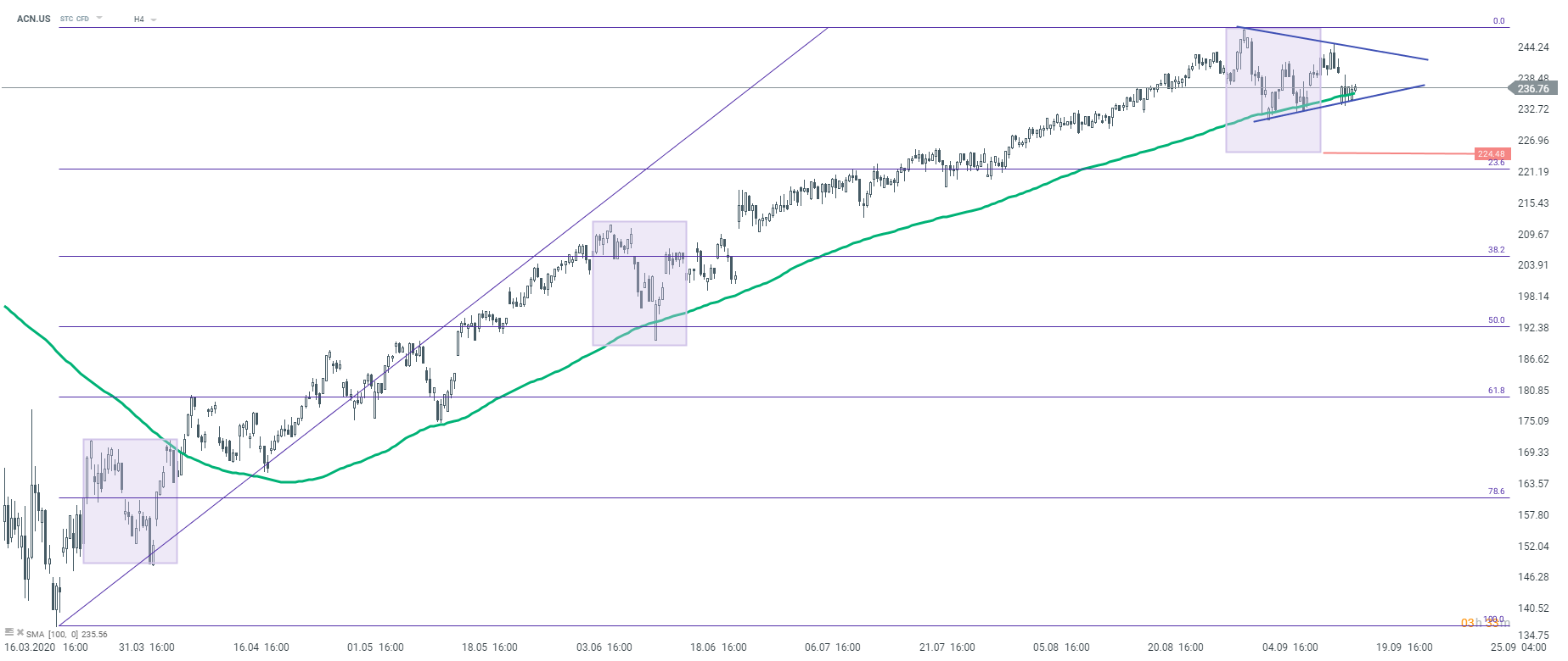 Accenture (ACN.US) a réussi à dépasser la moyenne mobile de 100 jours. On peut repérer un triangle local sur le graphique journalier. Source : xStation5
