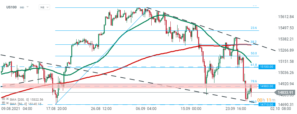 L'US100 a démarré la séance en hausse, mais les acheteurs n'ont pas réussi à franchir la résistance majeure à 14 900 pts et l'indice s'est replié vers le support à 14 710 pts, où se trouvent les creux du mois d'août. En cas de cassure à la baisse, la correction baissière pourrait s'accentuer. Source : xStation5