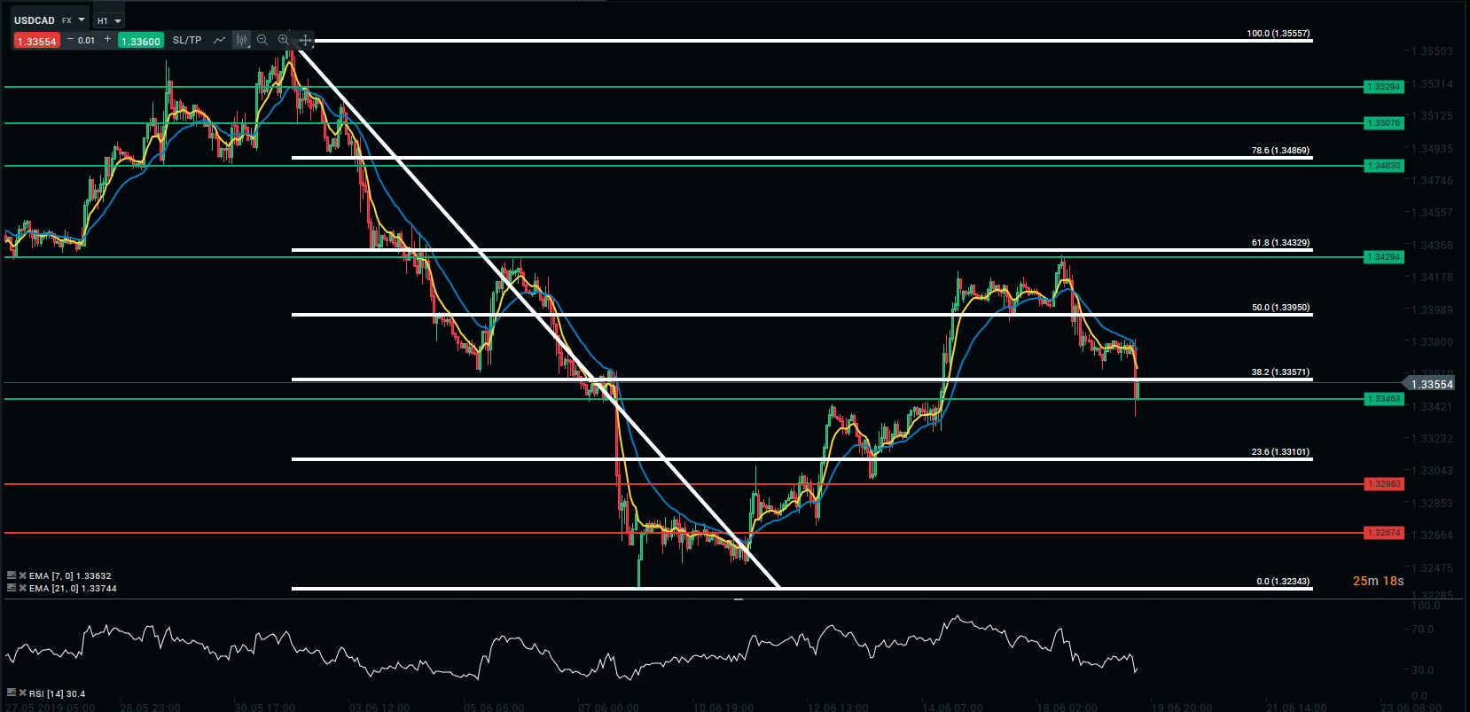 Sur le plan technique, nous pouvons voir que les vendeurs ont profité des données de l’inflation pour faire chuter paire sous le seuil des 1,3357 (38,2 % des retracements de Fibonacci). La chute du « loonie » a été stoppée au niveau des 1,3345 CAD pour 1 $. Nous assistons à un rebond technique de la paire. Les stocks de pétrole (16h30) et la décision monétaire de la Fed (20h) orienteront la paire.