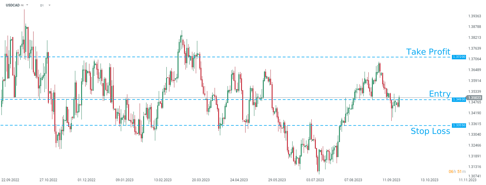 RBC recommande de prendre une position longue sur l'USDCAD au prix du marché avec un objectif de 1,3720 et un ordre stop placé à 1,3355. Source : xStation5