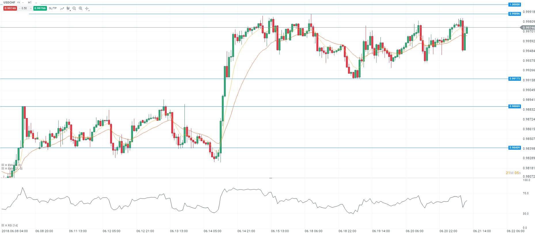Nous avons pris connaissance de la décision de politique monétaire de la Banque nationale suisse (BNS). Au travers d’un communiqué, l’institution a indiqué que « la BNS maintient le cap expansionniste de sa politique monétaire ». De plus, elle a rappelé que ses objectifs restent la stabilisation des prix et le soutien de l’activité économique. La BNS ouvre également la voie à une intervention sur le marché des changes en cas d’appréciation du franc suisse. Dans le même temps, les taux d’intérêts ont été maintenus à -0,75% en raison du contexte « fragile » sur le marché des changes. Enfin, l’institution a maintenu sa projection sur la croissance économique à 2% pour 2018 et a relevé sa prévision d’inflation à 0,9% pour la même période suite à la « hausse sensible des prix du pétrole ». Sur le plan du commerce extérieur, la balance commerciale suisse s’est améliorée au mois de mai avec un excédent de 2,7 milliards de francs suisses. Concernant l’analyse technique, les prix fluctuent au-dessus de la moyenne mobile courte (à 7 périodes) en unité de temps horaire (H1). Le RSI est orienté à la hausse vers sa zone de surachat. Ces éléments nous conduisent à avoir une préférence à l’achat avec pour objectif le niveau de 0,9989 franc.
