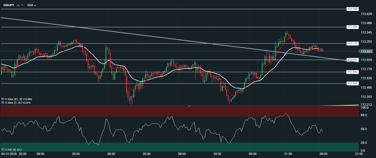 En unité de temps horaire (H1), la paire USDJPY évolue en tendance haussière. Toutefois, les cours sont capés par les moyennes mobiles à 7 et 21 périodes. Le RSI est orienté à la baisse mais reste proche de sa zone de neutralité (43 points). Dans ce contexte, nous attendrons un retour des cours sur le niveau des 112,92 Yen, puis nous serons haussiers avec pour objectif le niveau des 113,429 Yen.