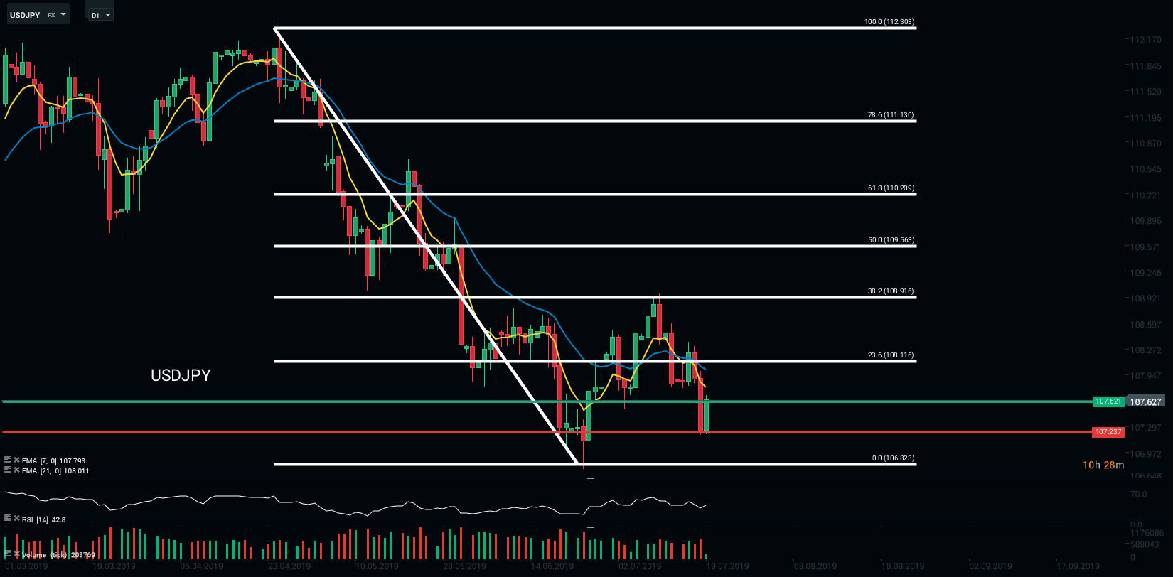 Sur le plan technique, le dollar s’est déprécié vis-à-vis du yen. Nous avons assisté par la suite à un rebond technique sur les 107,237 yens pour 1 $. Pour l’heure, la paire teste les 107,62 JPY. La prestation de Kuroda (BoJ) le 29 juillet est attendue par les cambistes avec impatiente.