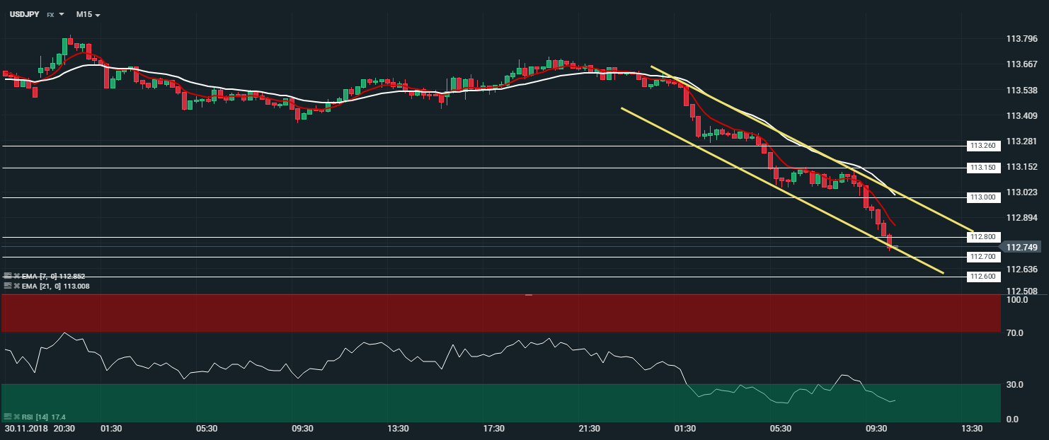 En unité de temps 15 minutes (M15), la paire USDJPY évolue en nette tendance baissière au sein de son canal baissier. Les cours sont capés par les moyennes mobiles à 7 et 21 périodes. Le RSI est orienté à la hausse au sein de sa zone de « sur vente » et oscille à 17 points. Dans ce contexte, nous serons baissiers sur la paire USDJPY, avec comme objectif le niveau des 112,700 ¥. - et par extension le niveau des 112,600 ¥