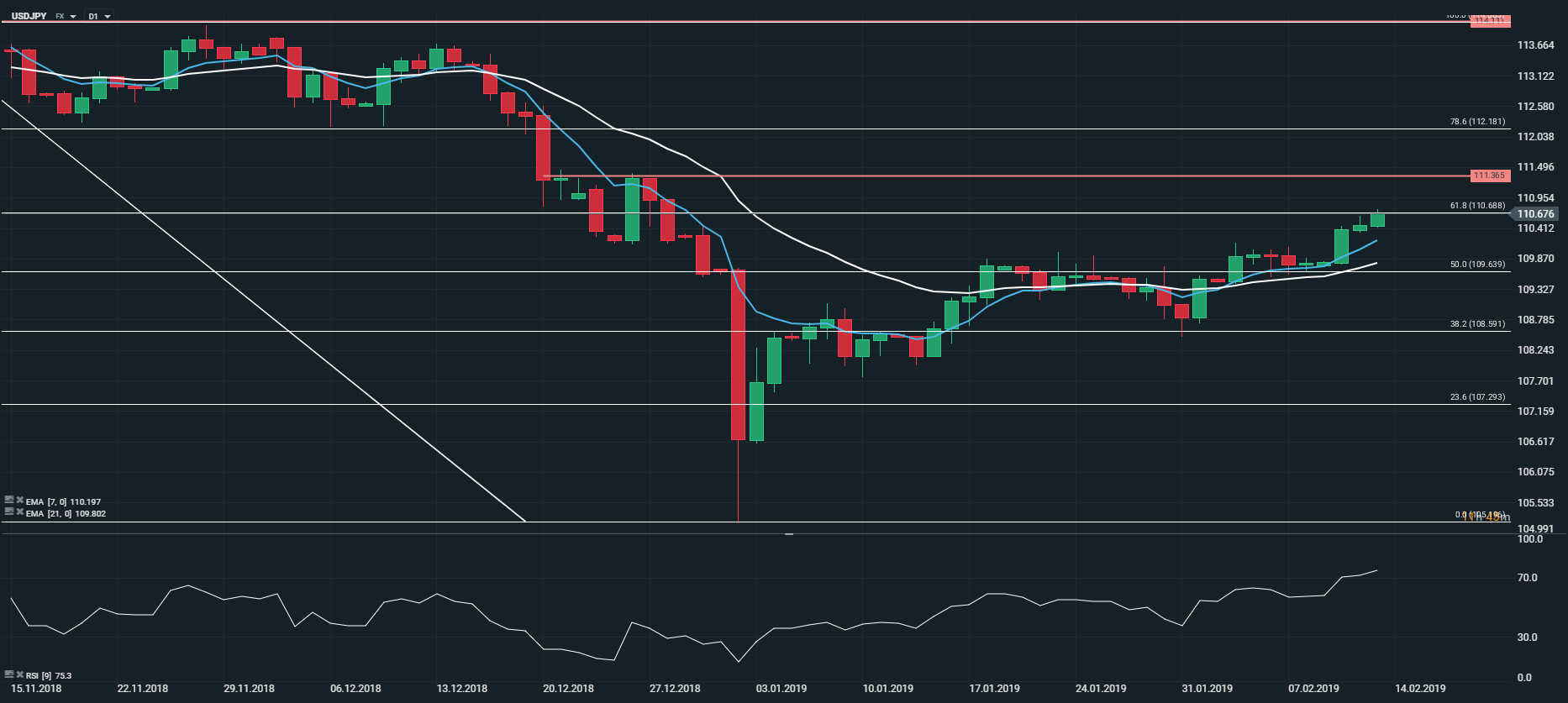 A Tokyo, l’indice NIKKEI 225 a terminé en hausse de 1,34 % à 21 144,48 points dans le sillage de Wall Street. La hausse de l’indice a été favorisée par l’amélioration des relations commerciales sino-américaines et l’accord sur le « shutdown » US. Sur le front de la macroéconomie japonaise, l’indice des prix à la production est ressorti en hausse de 0,6 % sur un an et s’est contracté de 0,6 % sur le seul mois de janvier. Sur le plan technique, la paire USDJPY évolue en tendance haussière en unité de temps journalière (D1). En effet, nous observons sur le graphique ci-dessus que les prix sont soutenus par les moyennes mobiles à 7 et 21 périodes, et ce, depuis plusieurs jours. En outre, le RSI est orienté à la hausse et fluctue à l’intérieur de sa zone de surachat. Enfin, nous estimons que les rendements des obligations américaines devraient continuer de gagner du terrain. C’est pourquoi nous avons un biais positif sur la paire USDJPY.